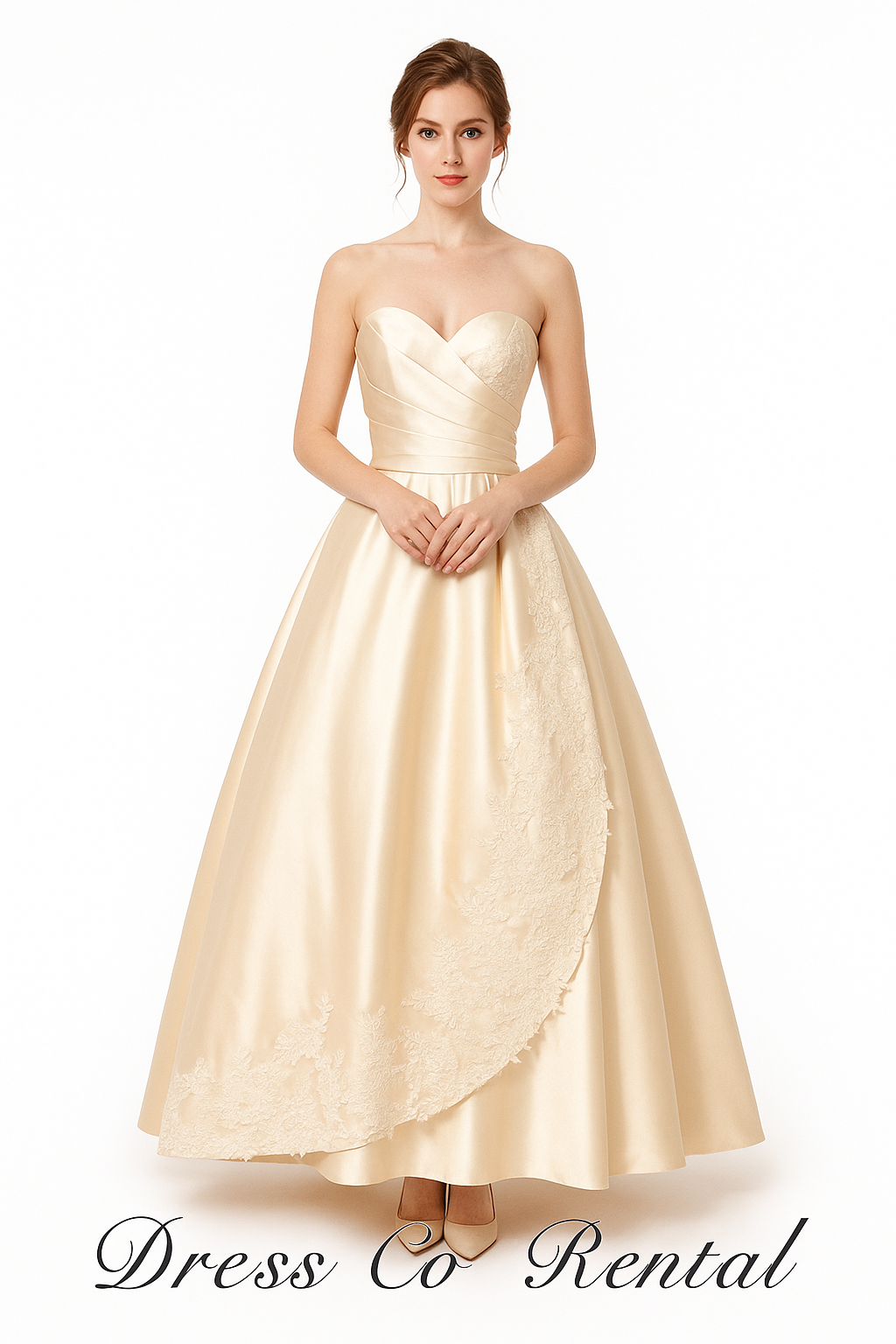 Cream colored dress with flared skirt, luxurious satin fabric, decorated with floral lace.