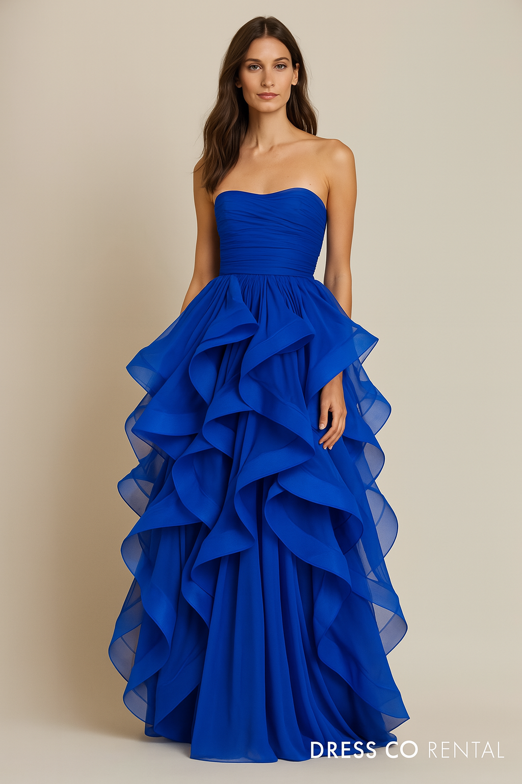 A strapless, high-low blue evening gown decorated with extravagant layers of ruffles, adding a striking touch to the wearer from every angle.