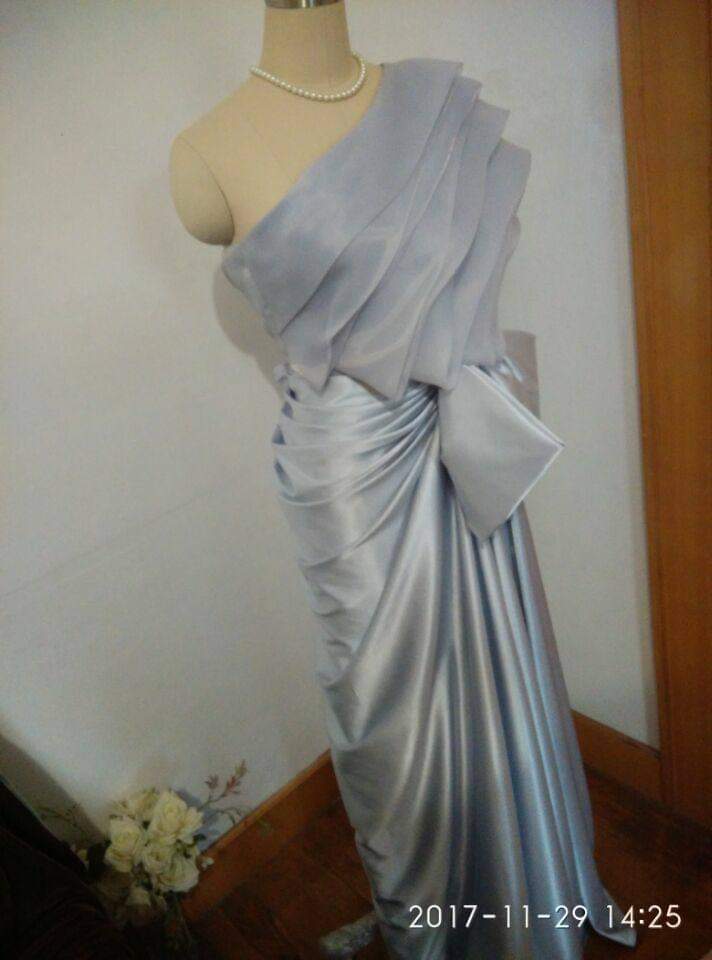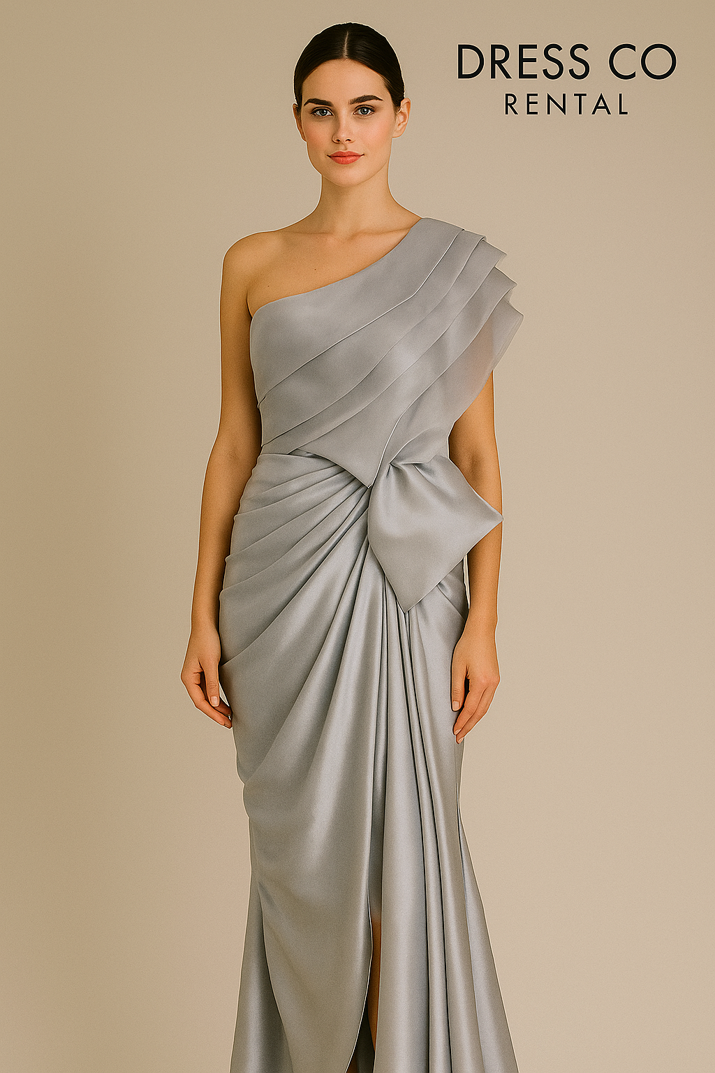 Silver satin dress with diagonal pleats, luxurious design, one-shoulder hem, adding a striking look.