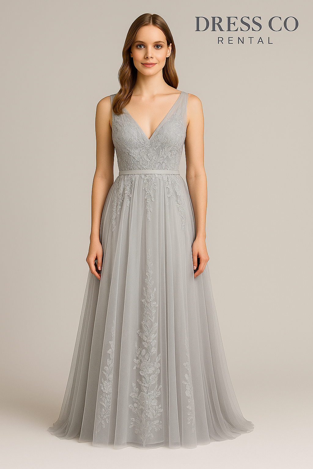 Elegant silver-gray evening gown with a sleeveless design and deep V-neckline. Features delicate floral lace embroidery along the bodice and down the flowing chiffon skirt, creating a graceful and elongating effect. The lightweight fabric adds softness and movement, perfect for weddings, evening events, or bridesmaids.