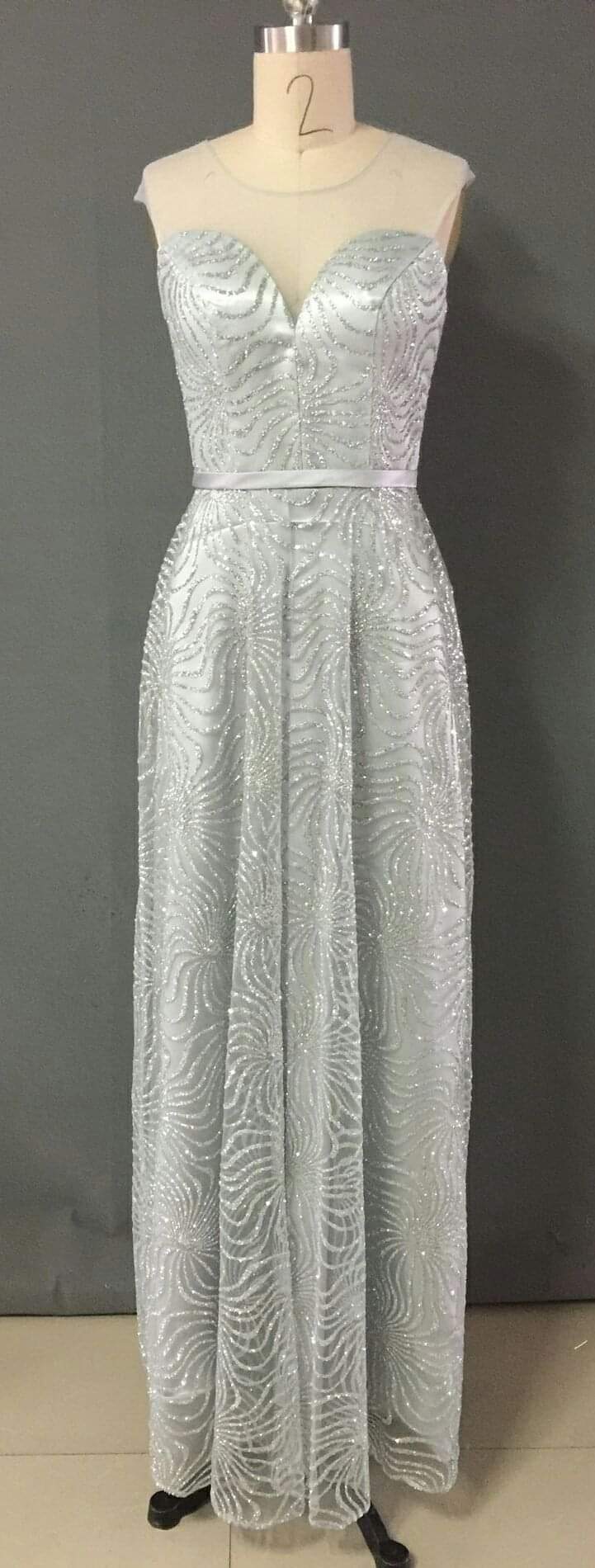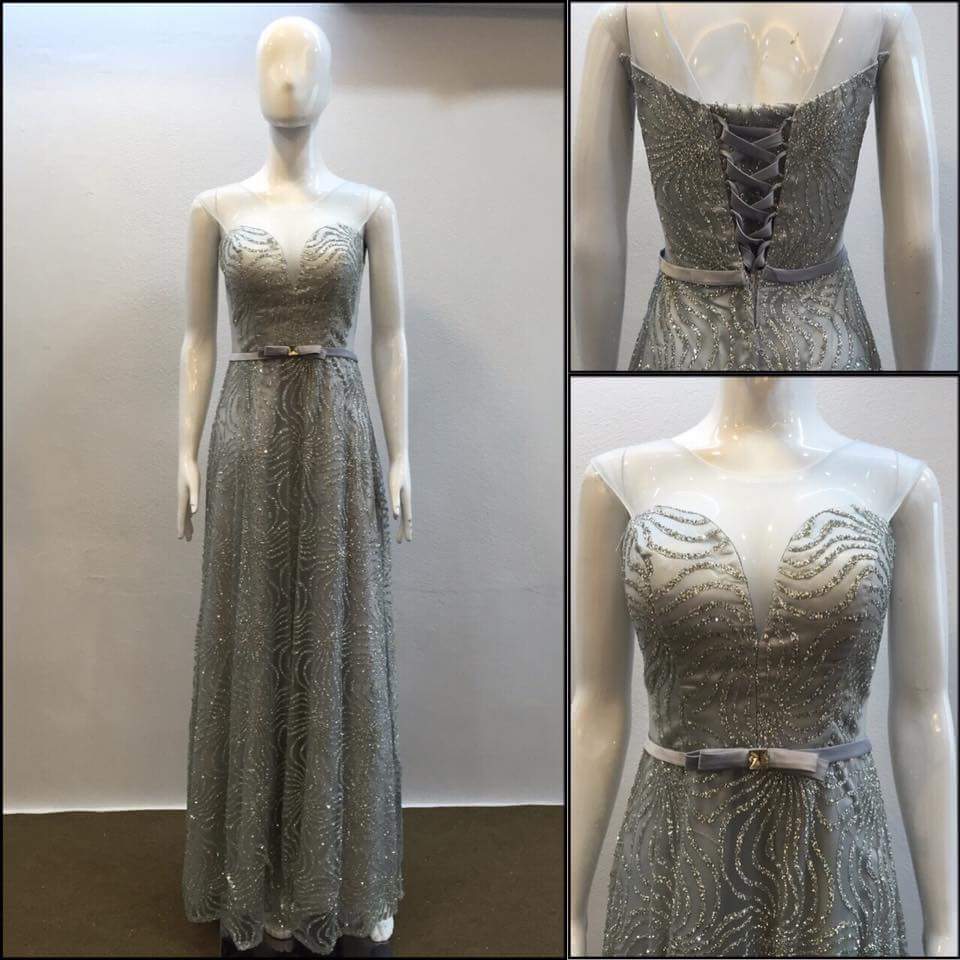 きらめくシルバーのAラインドレス。上質なグリッター生地と柔らかな透け感のあるネックラインが特徴です。シンプルながらもエレガントなサテンベルトがウエストラインを強調。優雅で華やかな雰囲気を演出し、ガラパーティー、授賞式、結婚式、そして素敵なプレウェディングフォト撮影に最適です。