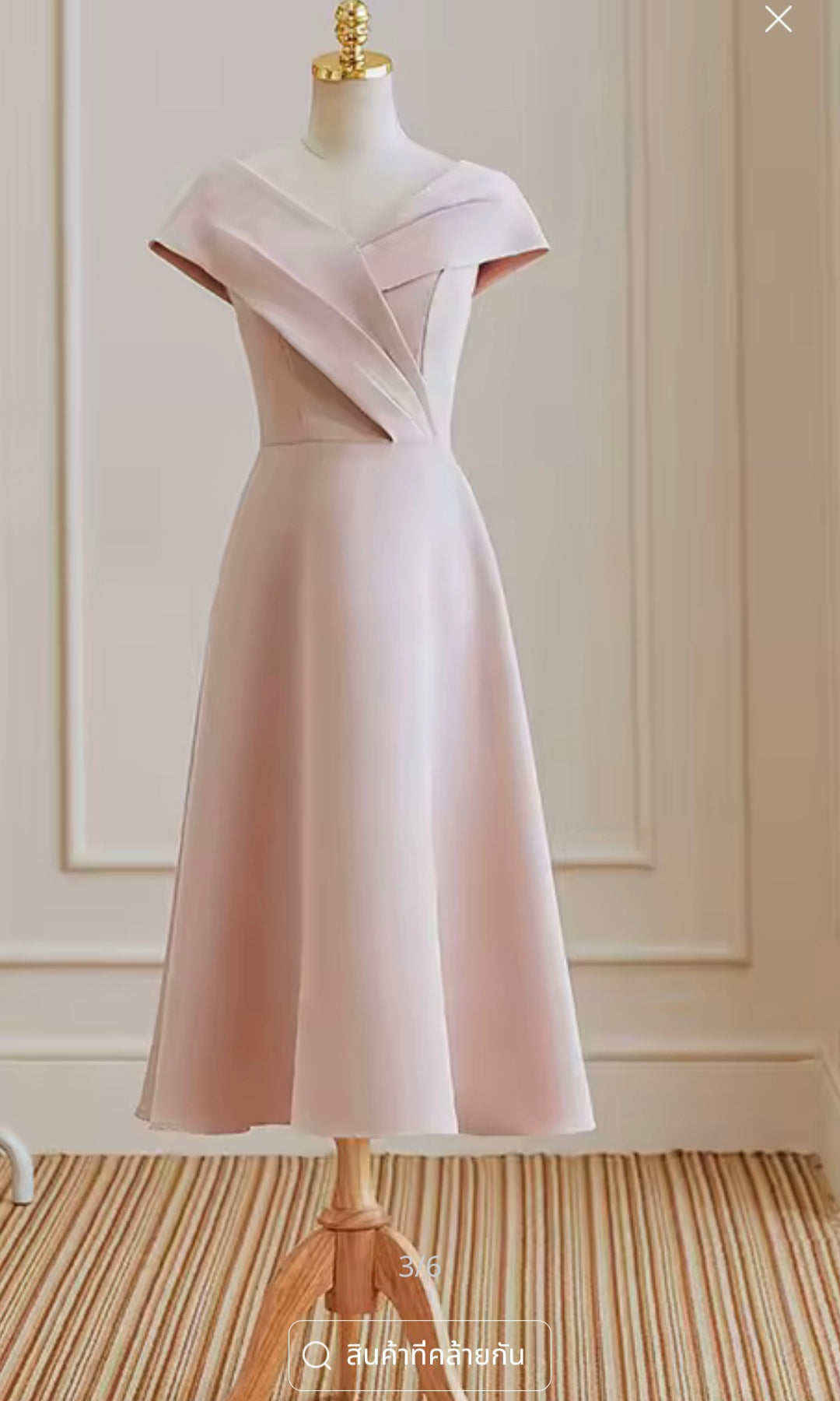 เดรสคอปาดดีไซน์ไขว้ด้านหน้า สีชมพูอ่อนหวาน ตัวกระโปรงทรง A ยาวคลุมเข่า เนื้อผ้าลื่นเงาสวย สวมใส่ง่าย เสริมลุคเรียบร้อยหรูหรา