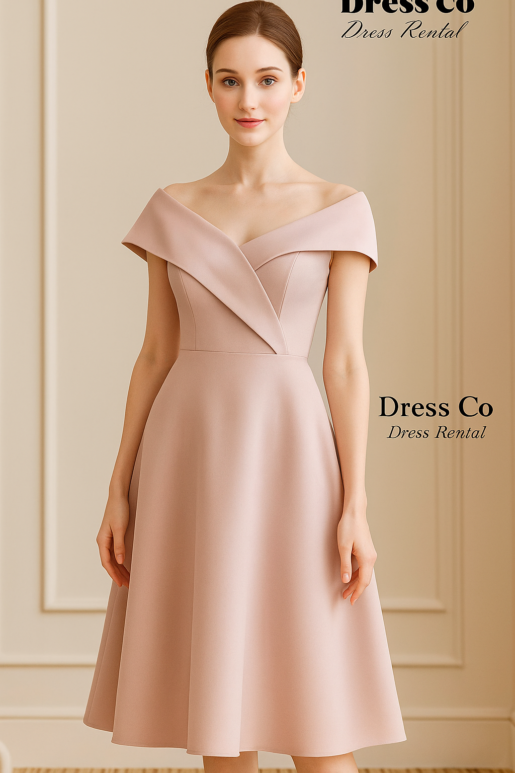 Elegant soft pink bardot dress with a unique cross-front neckline. Features an A-line silhouette and a flattering midi length.