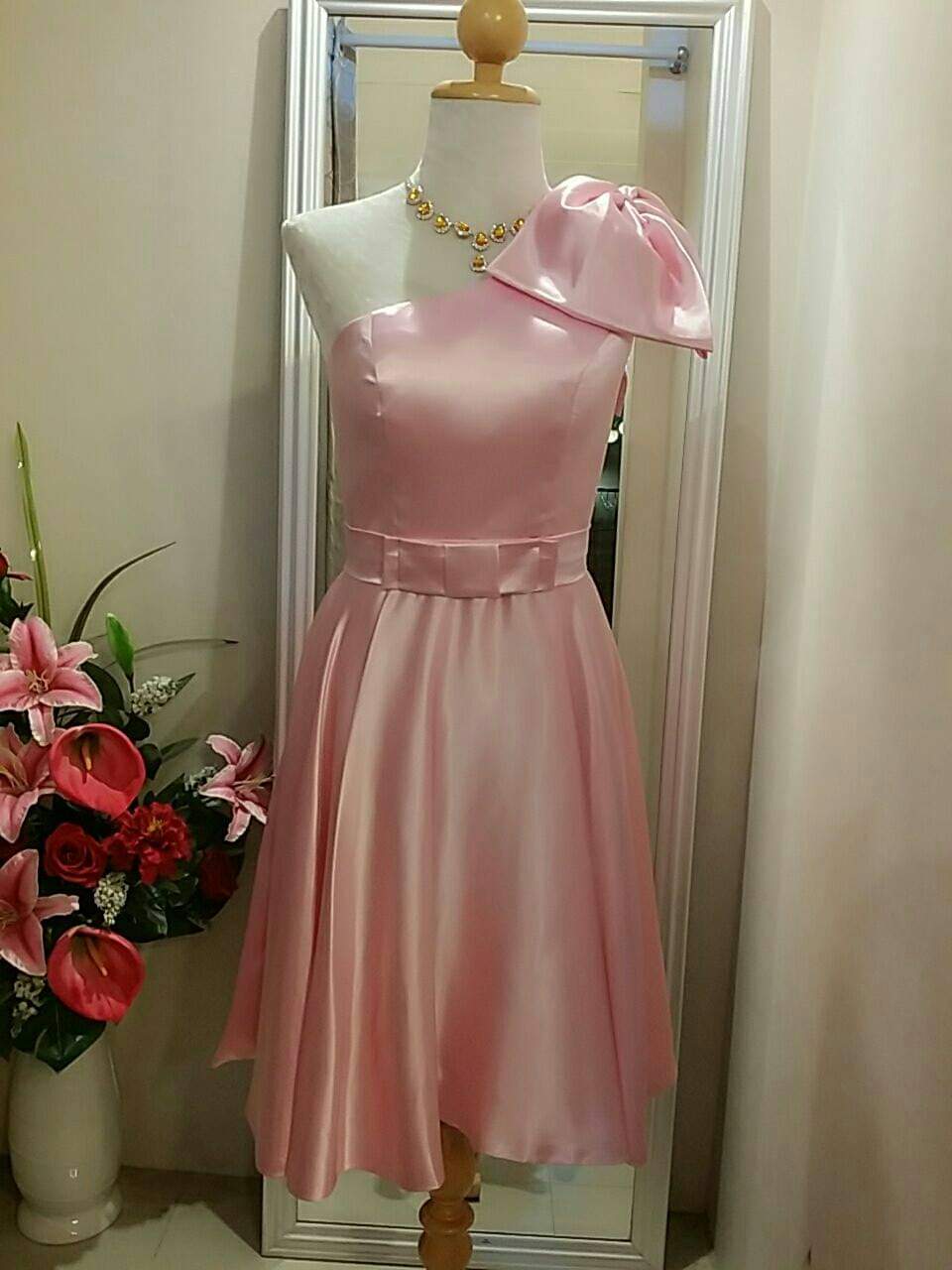 เดรสสั้นไหล่เดียวสีชมพูพาสเทล พร้อมโบว์หรู