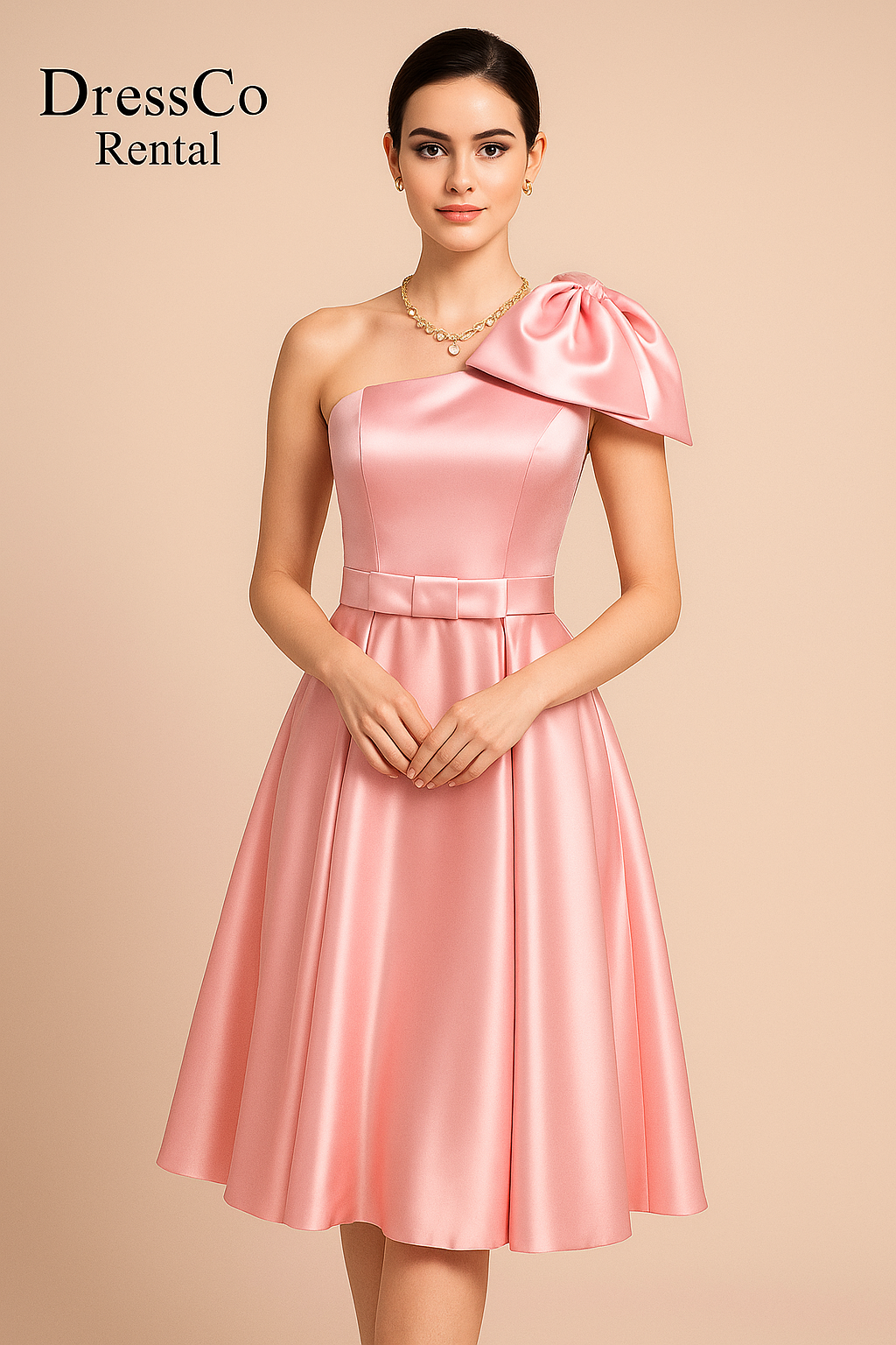 This charming pastel pink satin dress features a one-shoulder design with a luxurious oversized bow, exuding feminine elegance. Made from smooth, glossy satin, the flared skirt adds graceful movement, while the fabric belt cinches the waist for a flattering silhouette. Ideal for weddings, cocktail parties, and pre-wedding photoshoots.
