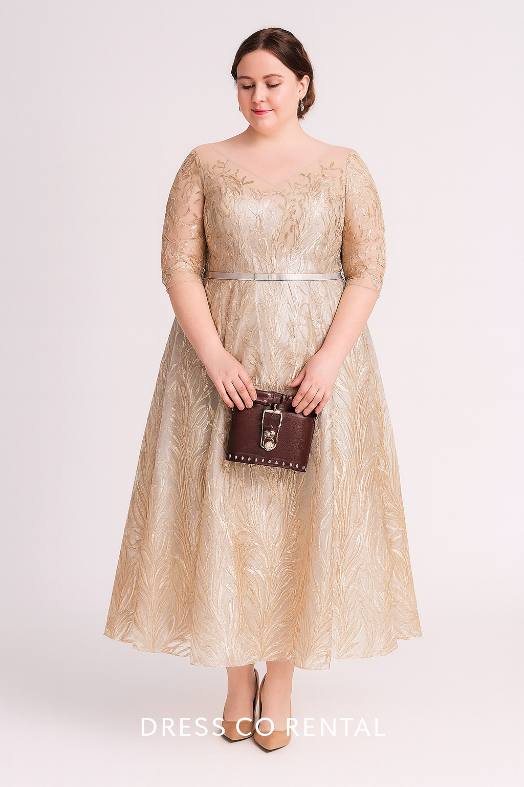 เดรสออกงานสีทองทรง A-Line สวยหวาน เพิ่มความหรูด้วยลายปักวิบวับทั่วชุด แขนซีทรูครึ่งแขนให้ความสุภาพ เหมาะสำหรับงานแต่ง งานเช้า งานเลี้ยง และงานผู้ใหญ่ • ไซซ์ M, XL • ราคาเช่า 1,500 บาท