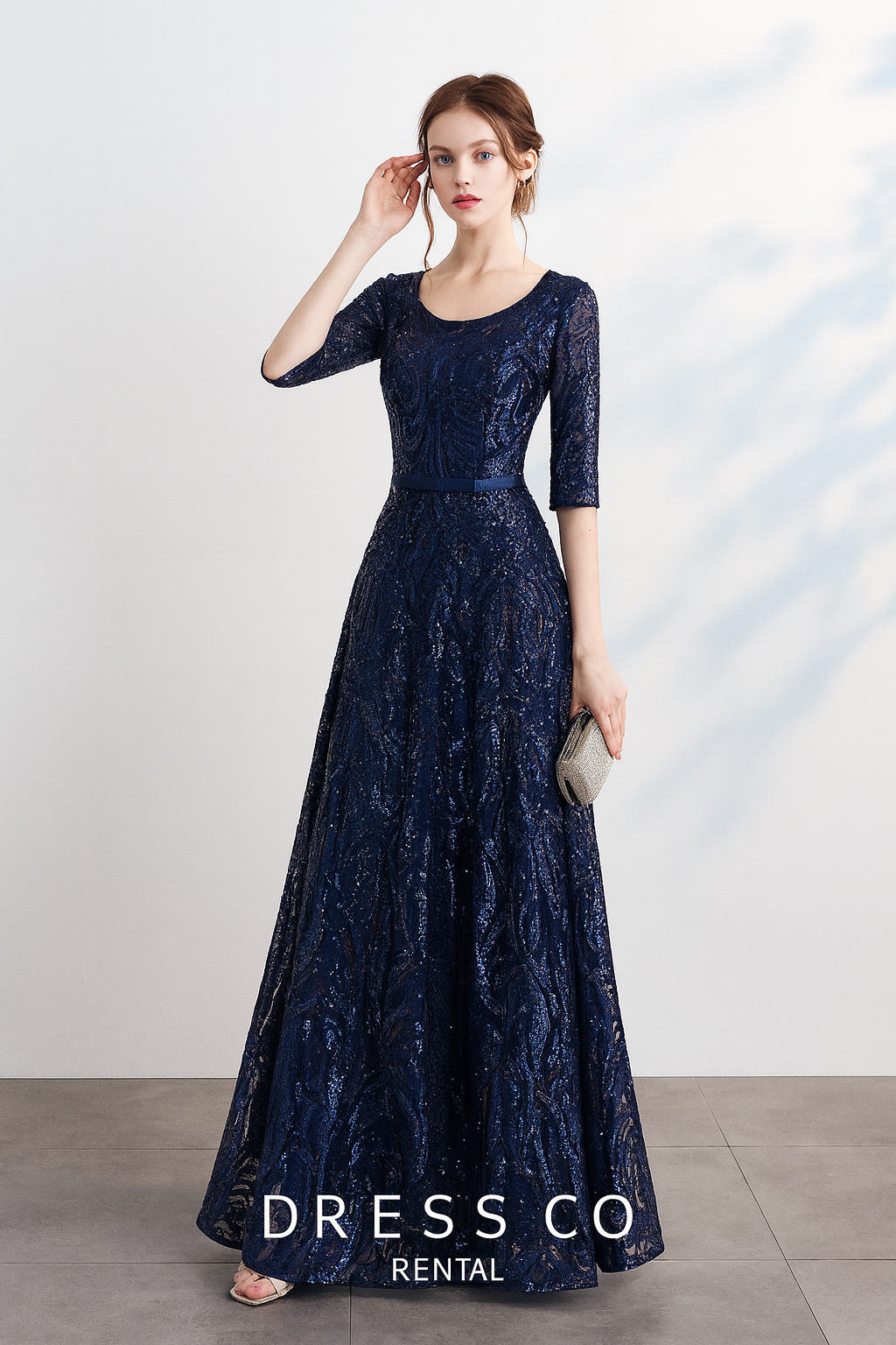 เดรสออกงานสีน้ำเงิน กากเพชร แขนสามส่วน ทรงหรูหรา (Size M)