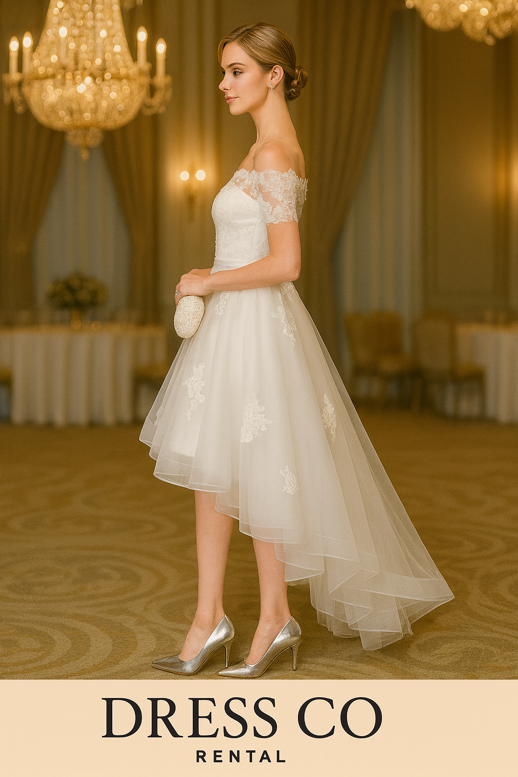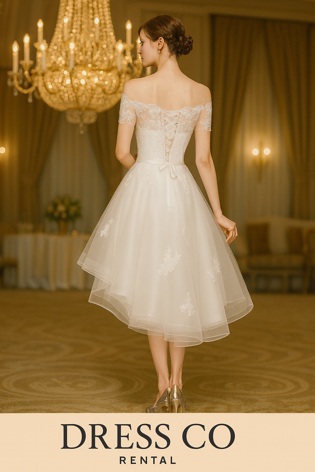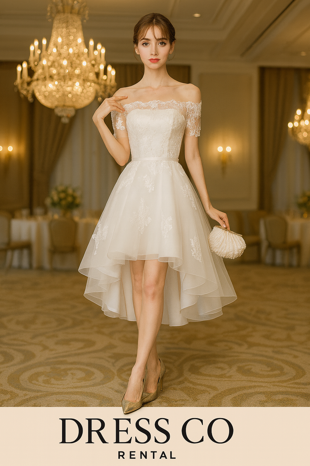เดรสเจ้าสาวสั้นหางปลา ไหล่ตกลูกไม้ สีขาว – Size M