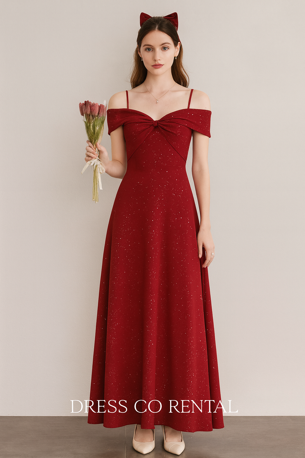 เดรสแดงบ่าเปิดทรงโบว์ คอปาด ระยิบระยับ – ไซส์ M