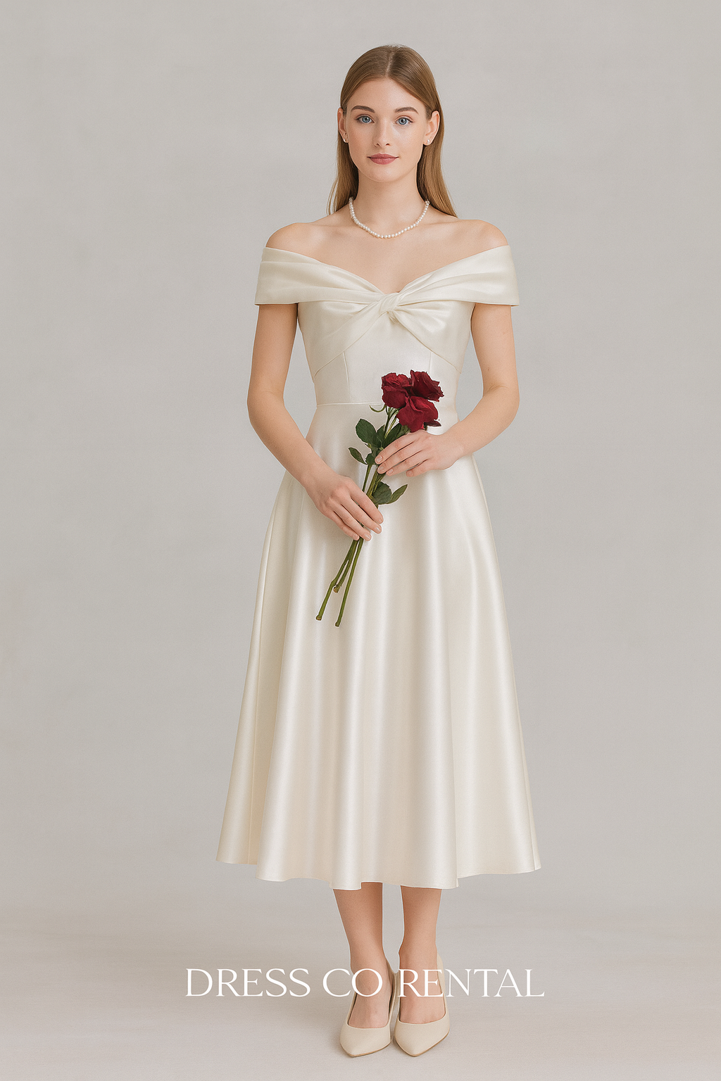 เดรสโทนออฟไวท์ทรงหรู เปิดไหล่ดีไซน์เก๋ พร้อมดีเทลโบว์ด้านหน้า หรูหรา เรียบร้อย เหมาะสำหรับงานแต่ง งานเลี้ยง และงานสำคัญต่าง ๆ เนื้อผ้าซาตินพรีเมียม ใส่แล้วช่วยเก็บทรงสวย