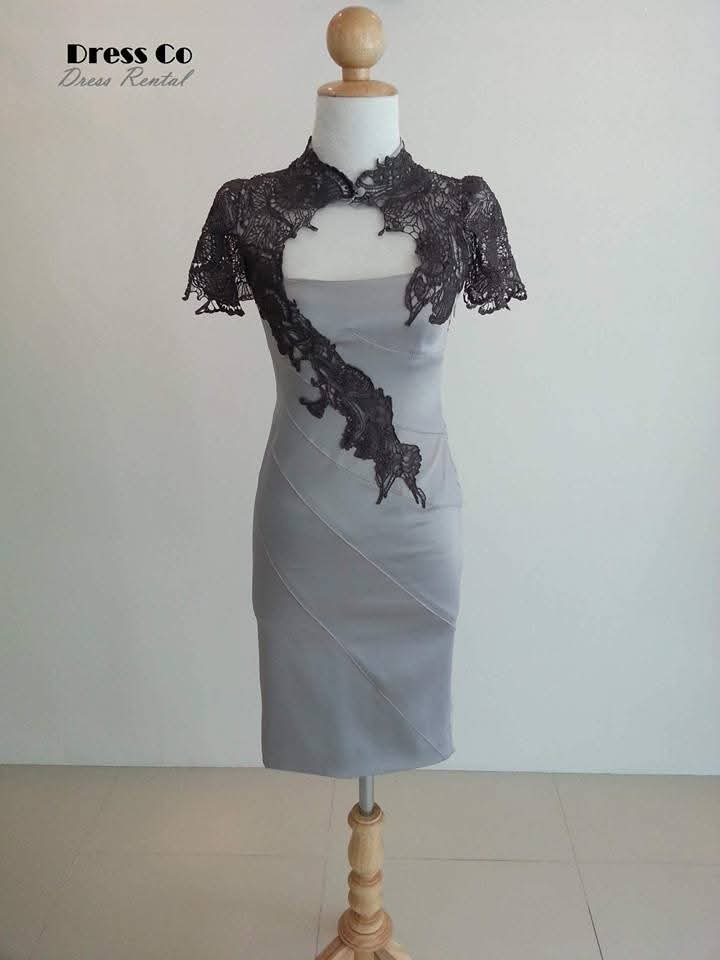 ชุดเดรสเข้ารูปสีเทาอ่อน แต่งลูกไม้คลุมไหล่และลายลูกไม้เฉียงช่วงตัว เพิ่มลุคสง่างาม ใส่ได้ทั้งงานเลี้ยง งานพิธี