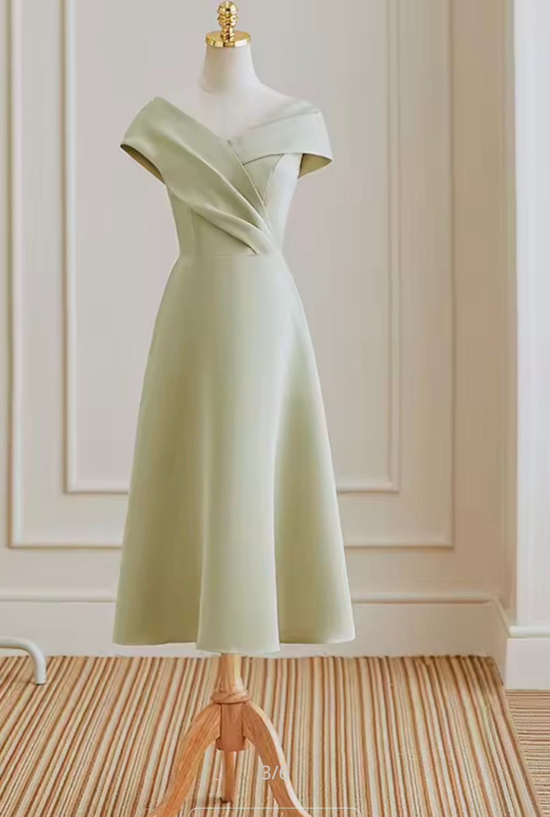 Elegant knee-length evening dress in a mint green pastel tone. Designed with a stylish off-shoulder cross-fold detail, made from smooth premium fabric. Perfect for weddings, cocktail parties, and graduation events.