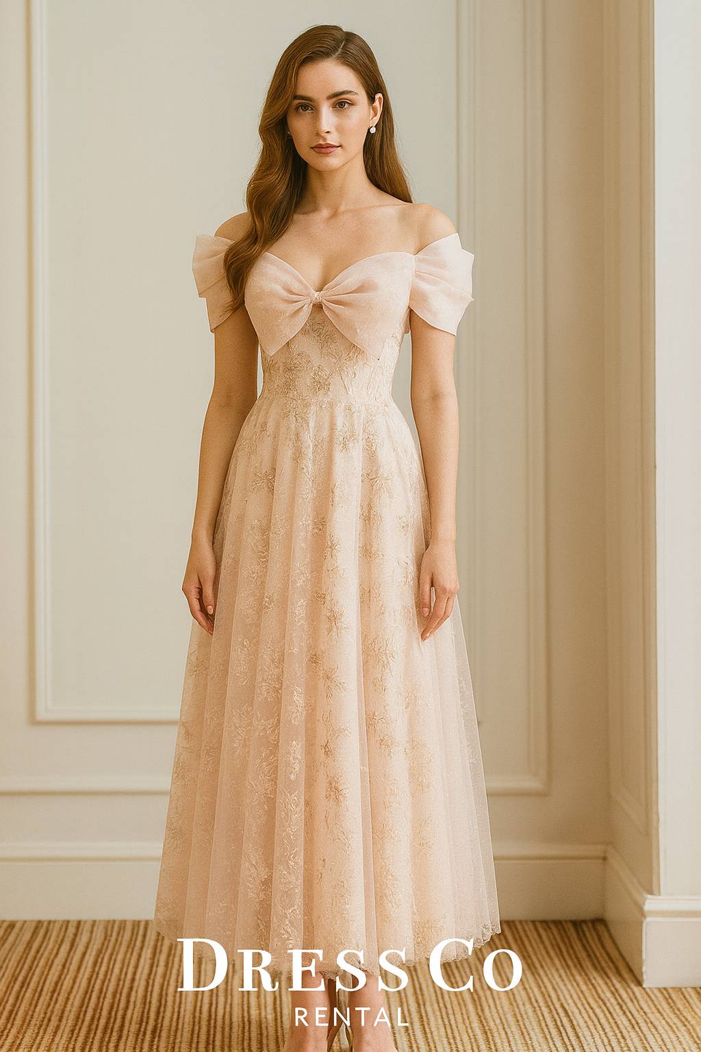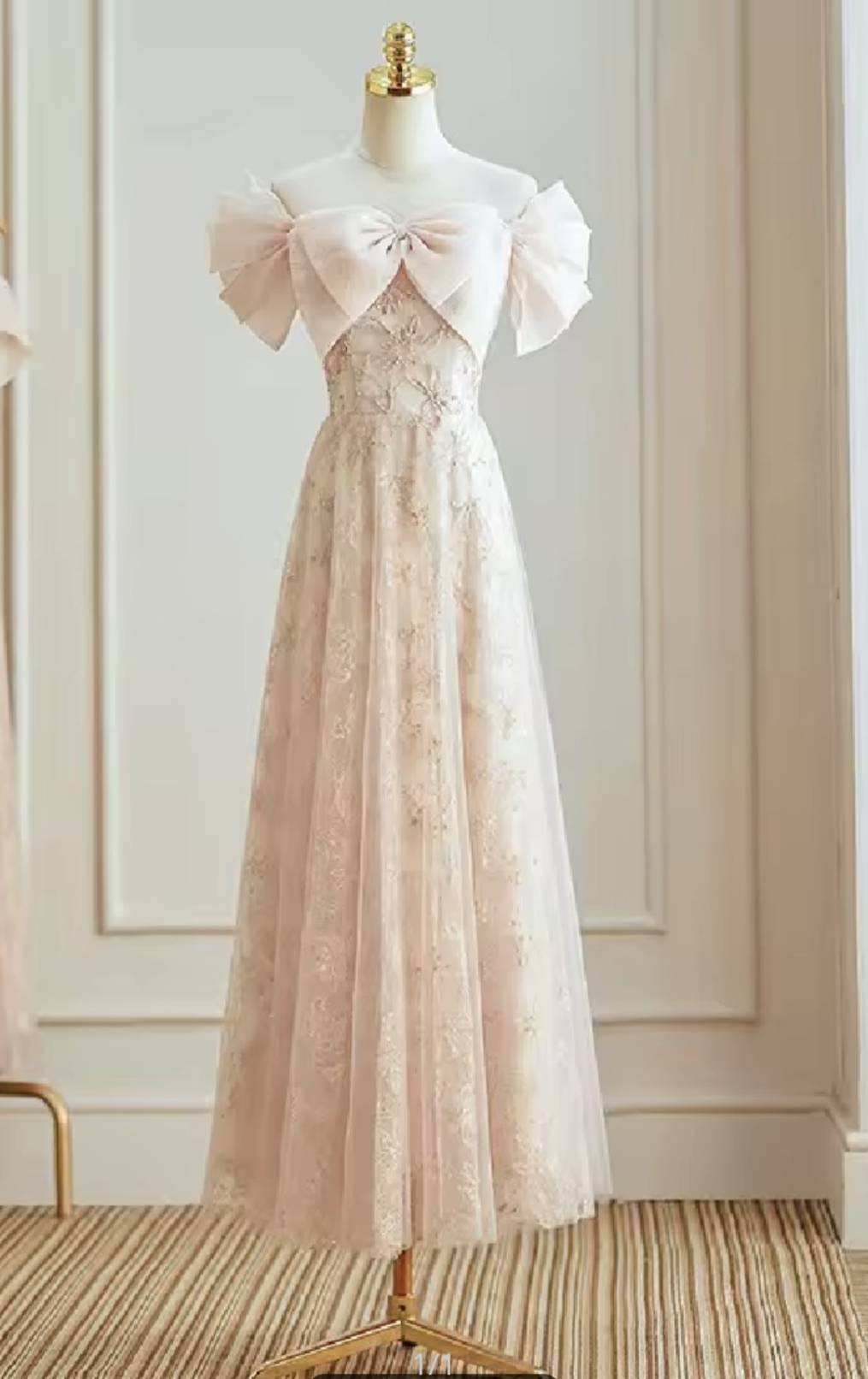 ชุดราตรียาวโทนสีพีชสุดหวาน เนื้อผ้าลูกไม้ปักลายละเอียด ผสมผ้าทูลล์บางเบา ดีไซน์เปิดไหล่พร้อมโบว์ใหญ่ด้านหน้า กระโปรงทรง A-Line ใส่แล้วดูสูงเพรียว เหมาะสำหรับไปงานแต่ง งานเลี้ยง งานถ่ายรูป และทุกโอกาสพิเศษ