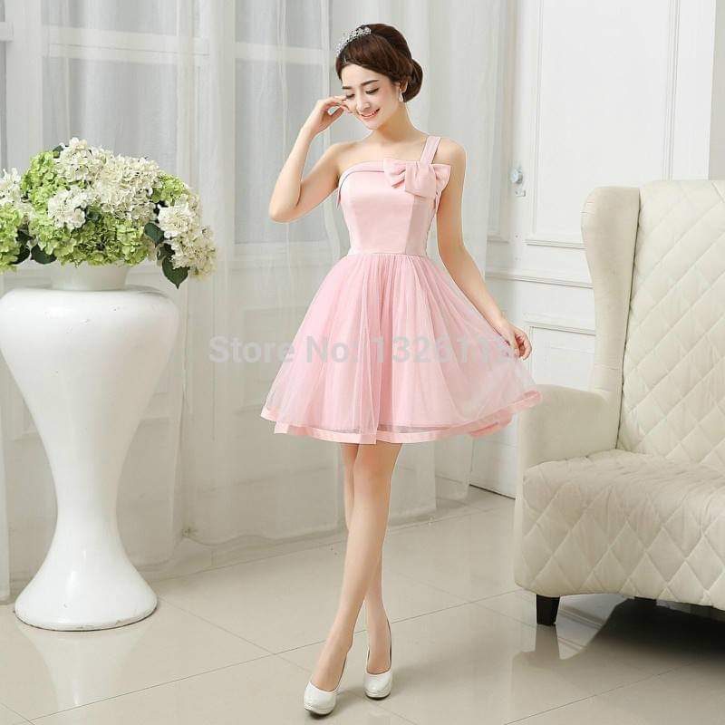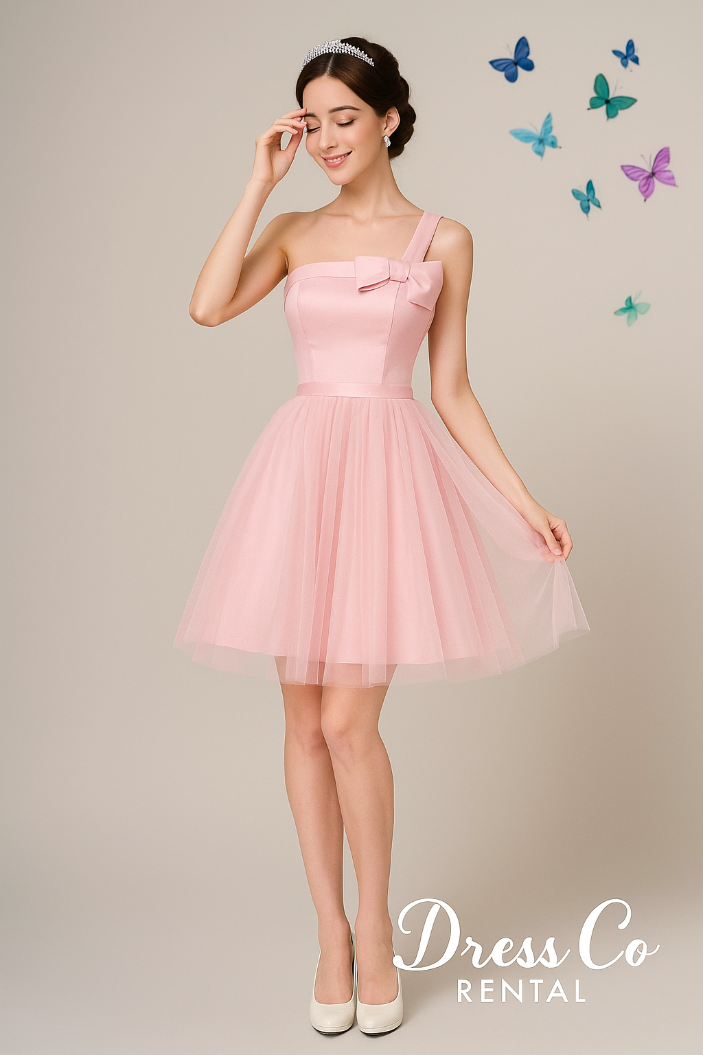 เดรสสั้นสีชมพูหวาน สายเดี่ยวแต่งโบว์ไหล่เดียว ผ้าชีฟองเบา ใส่ออกงานหรือปาร์ตี้ได้