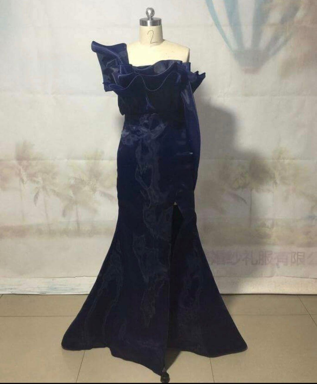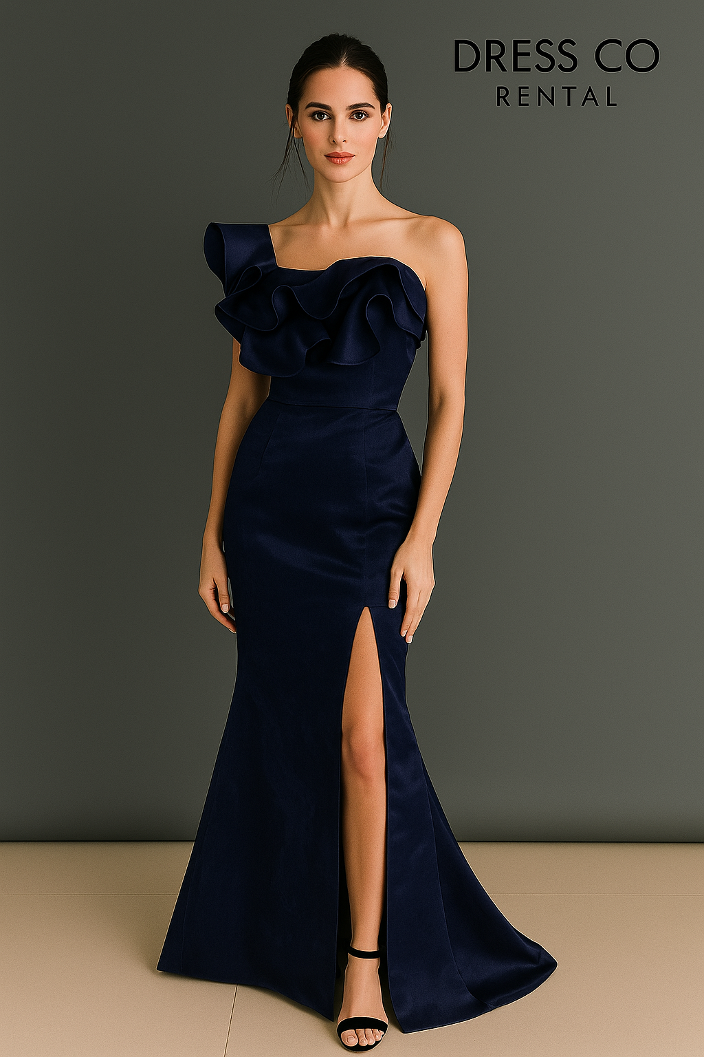 An elegant navy blue gown featuring an asymmetrical one-shoulder neckline adorned with dramatic ruffles. The form-fitting silhouette and high front slit create a sophisticated yet daring look. Made from premium fabric, this gown is ideal for weddings, galas, and evening events that demand standout style.